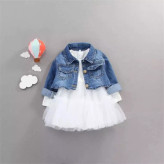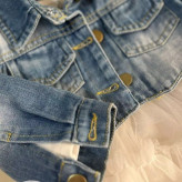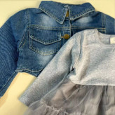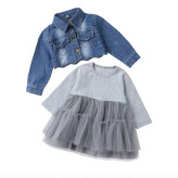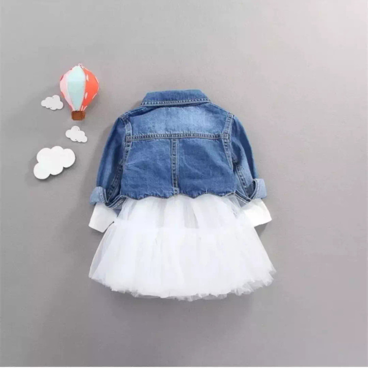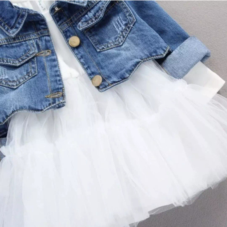 ست دو تکه ی پیراهن و کت جین رنگ سفید سایز ۵ رنگ طوسی سایز ۱۱ بالا تنه نخ پنبه و دامن دو لایه تور و یک لایه نخ کت جین